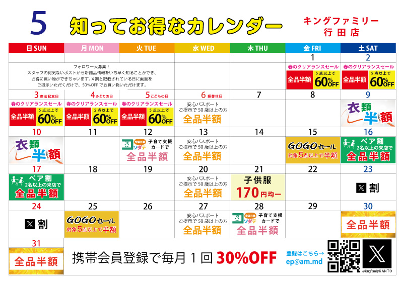 5点半額♪※衣類・くつ・かばん・小物類、 どれでも5点以上お買上げで半額!! ※他のイベントが重なる日など、開催されない日がございます。 詳しくは下のイベントカレンダーをご参考にしてください。 ※会員カードをご提示ください |