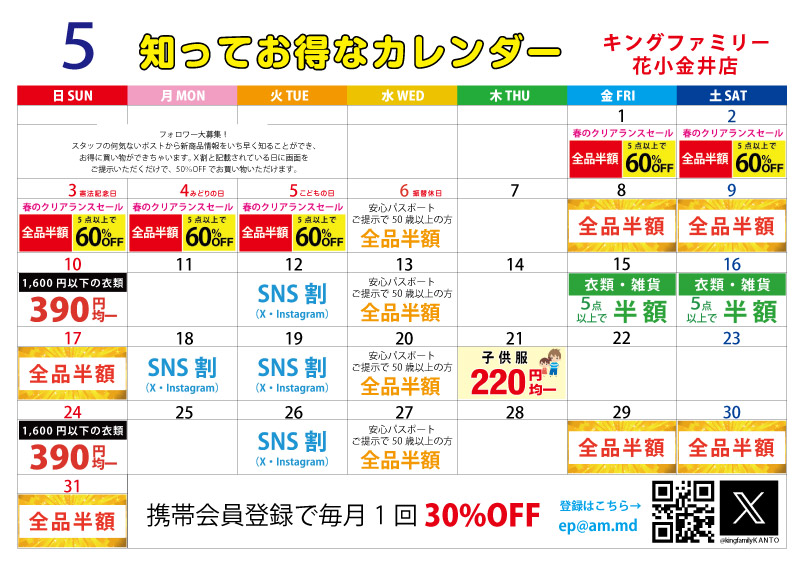 | 毎週水曜日 | シニア割半額 50歳以上の方限定!毎週水曜日は安心パスポートご提示で半額でお買上げいただけます♪ (安心パスポートは店頭で無料配布中) |