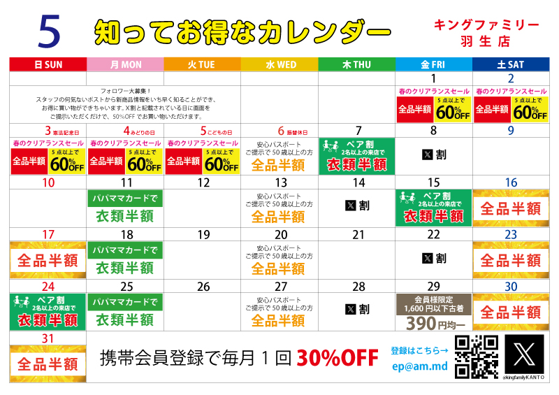 | 毎週月曜日 | 子育て応援パスポートのご提示で衣類半額 |